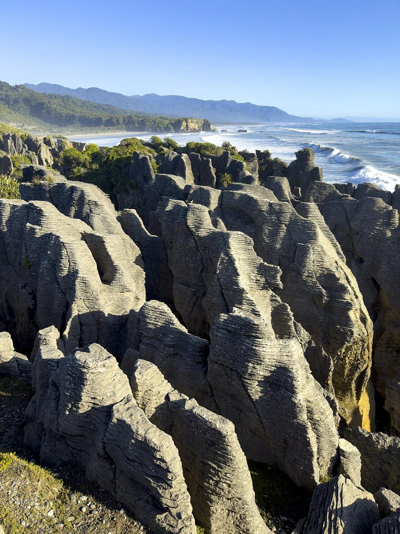 The Great Coast Road, running from Westport to Kumara, follows ancient limestone cliffs along Paparoa National Park.