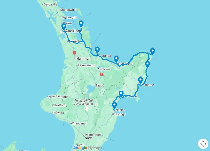 A 10-day loop from Auckland, heading south. Adjust as you go — some days the coast pulls you longer.